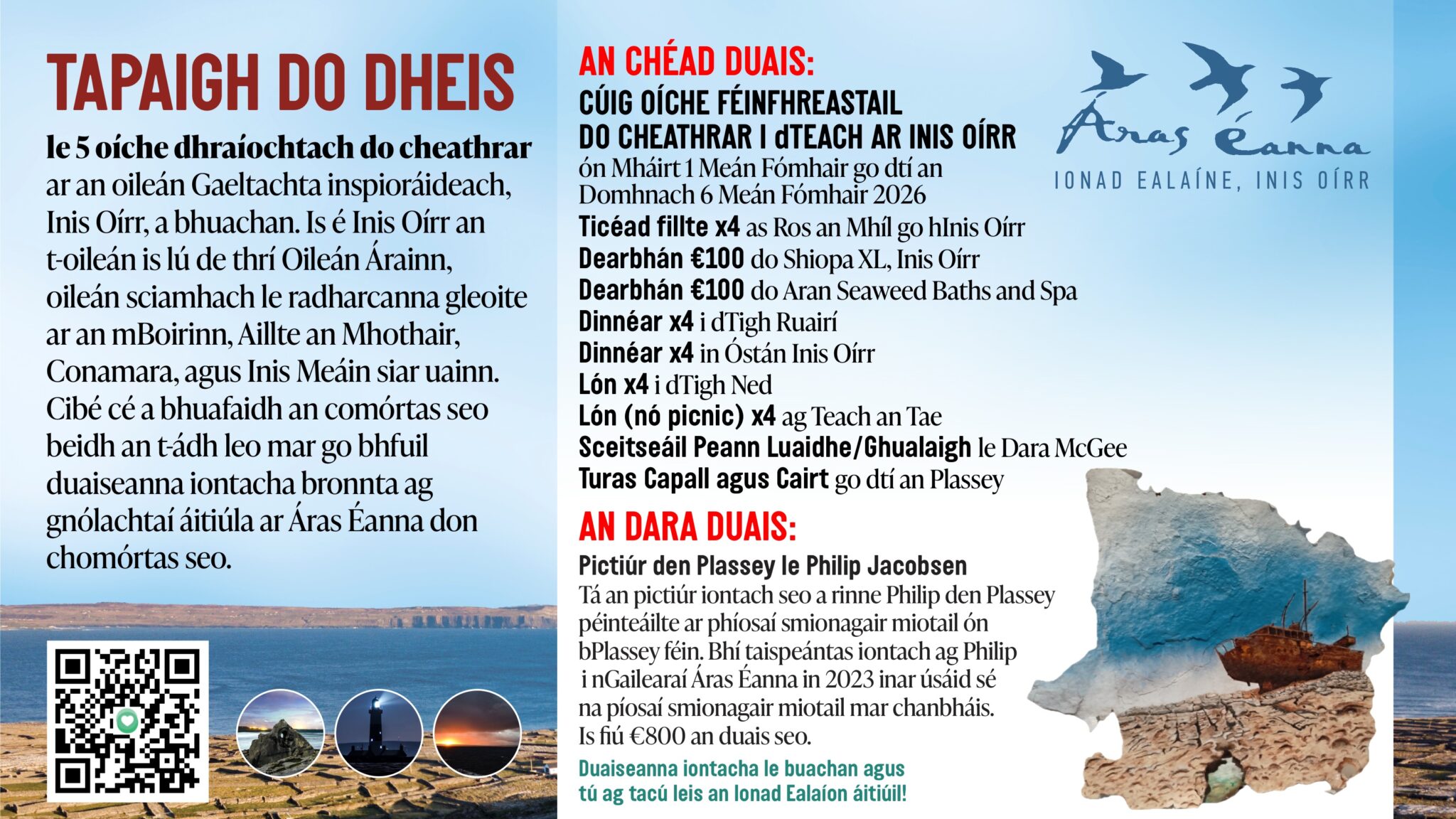 Tapaigh do dheis le 5 oíche dhraíochtach do cheathrar ar an oileán Gaeltachta inspioráideach, Inis Oírr, a bhuachan. Is é Inis Oírr an t-oileán is lú de thrí Oileán Árainn, oileán sciamhach le radharcanna gleoite ar an mBoirinn, Aillte an Mhothair, Conamara, agus Inis Meáin siar uainn. Cibé cé a bhuafaidh an comórtas seo beidh an t-ádh leo mar go bhfuil duaiseanna iontacha bronnta ag gnólachtaí áitiúla ar Áras Éanna don chomórtas seo